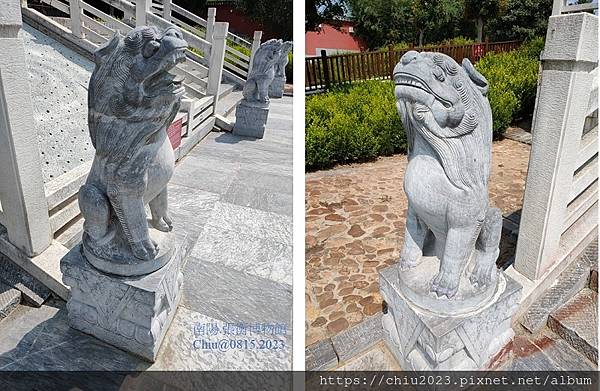 張衡博物館享堂前階梯下,有四隻石獅,姿勢正是朝天吼叫。